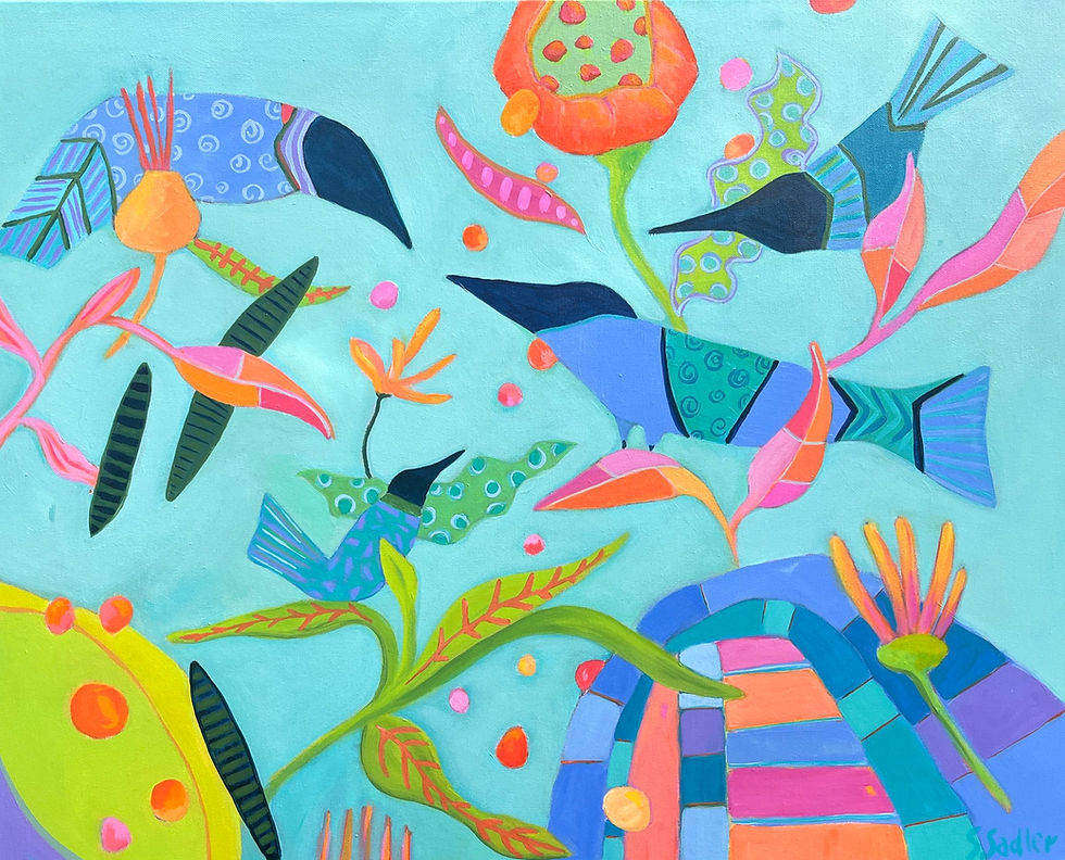 This painting is bright, playful and full of character. It features a large red-orange bird perched on top of two stylized cats against a lime green background. The work is an original acrylic on a 20x20 canvas with 1.5 in finished gallery wrap.